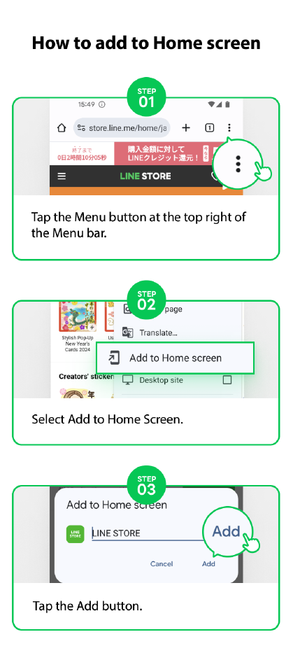 這時推薦您使用在智慧手機的主頁畫面新增LINE STORE的功能,即可隨時輕鬆前往LINE STORE!