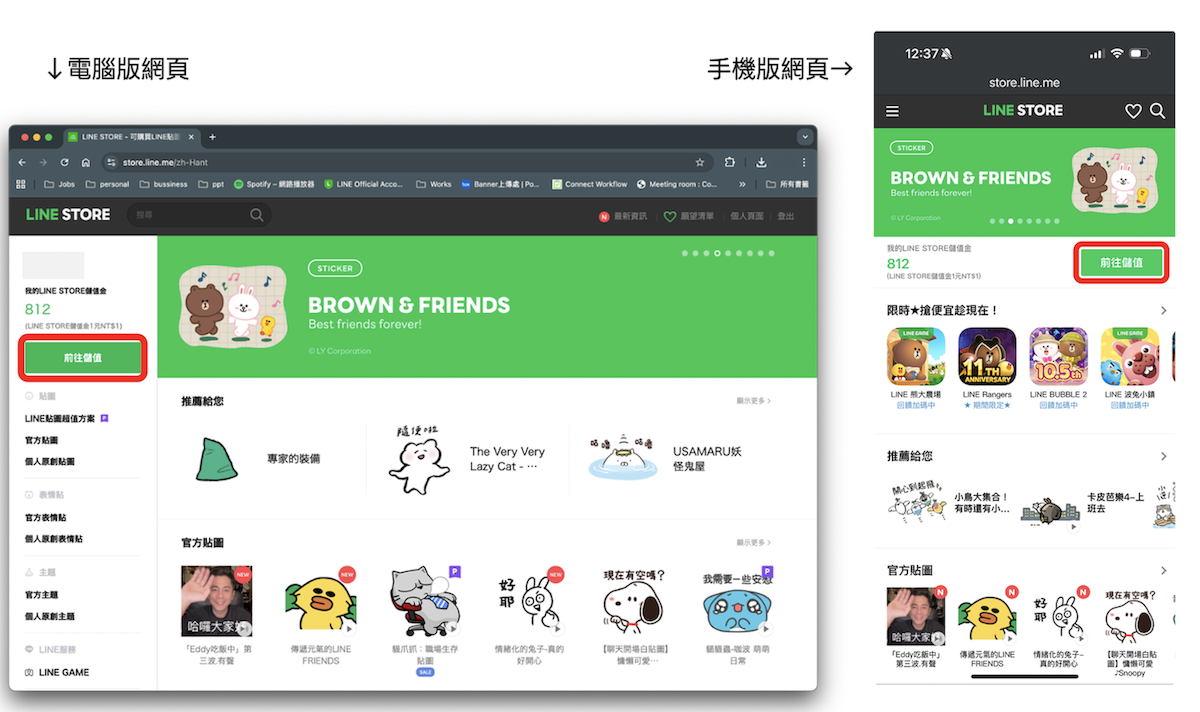 1. 前往 LINE STORE 首頁,找到「前往儲值」按鈕並點選