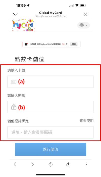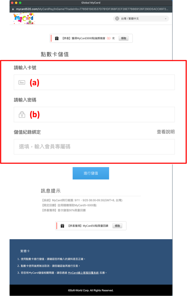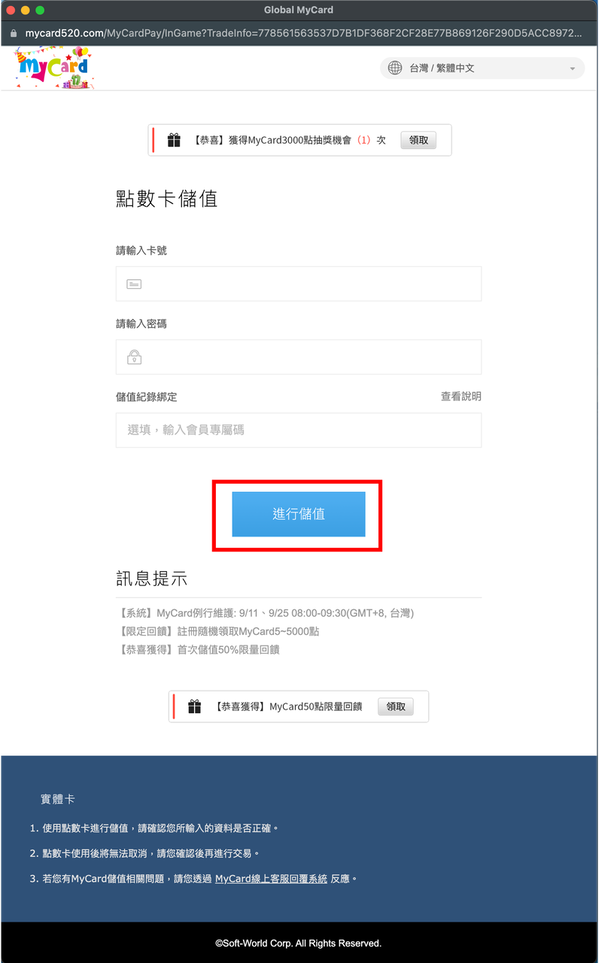 輸入完畢後,按下「進行儲值」如下圖紅框處,即可儲值。