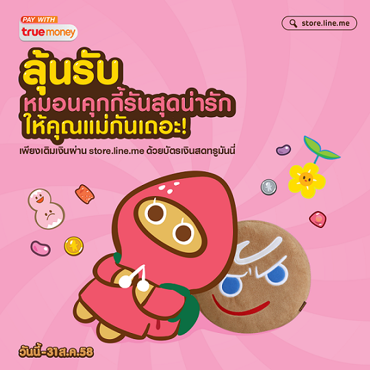 โปรโมชั่นดีๆ จากไลน์สโตร์และทรูมันนี่ เพียงเติมเครดิต LINE ผ่านเว็บสโตร์ด้วยบัตรเงินสดทรูมันนี่ มีสิทธิลุ้นรับหมอนคุกกี้รันจำนวน 60 รางวัล มูลค่่ากว่า 70,000 บาท!