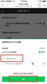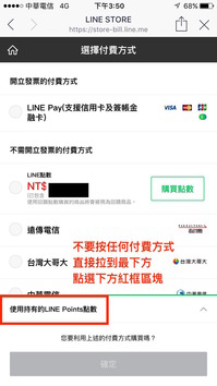 Step1. 在網頁版LINE STORE選擇喜歡的任一款貼圖,按下購買後,選擇付費方式「使用持有的LINE Point點數」,使用全部進行兌換,按下確定即可完成