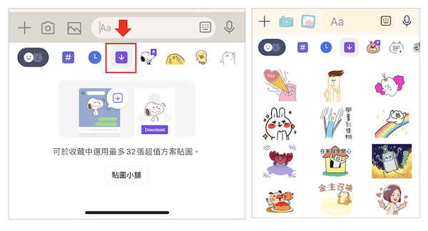 (只要在貼圖鍵盤上多看到「紫色下載」的符號,即可使用「收藏」功能。)