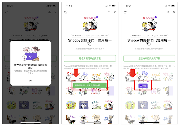 當你收到某張LINE貼圖超值方案的貼圖時,下載圖示會顯示在貼圖右側,只要點擊該圖示即可下載。
